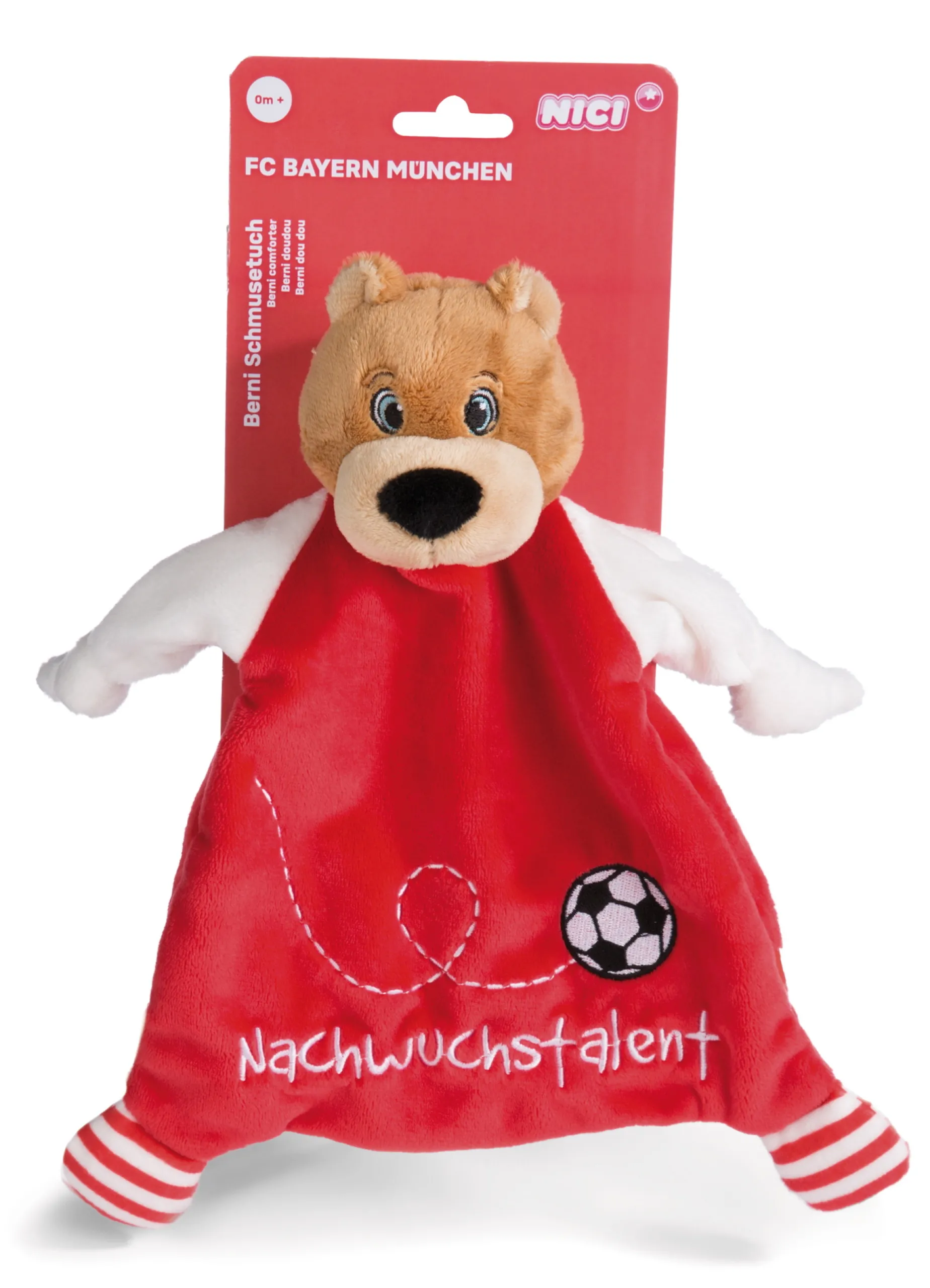 Kultmaskottchen Bär Berni als unverzichtbares Schmusetuch für Babys, ist aus einem super soften Material gefertigt und lädt zum Greifen, Fühlen und Knuddeln ein. Die rote Farbgebung des Schnuffeltuchs, die hochwertige Verarbeitung und das detailverliebte Design machen aus dem FC BAYERN MÜNCHEN Baby Schmusetuch eine wundervolle Geschenkidee zur Geburt, Taufe oder erstem Geburtstag! Die gestickte Botschaft „Nachwuchstalent“ des Schmusetuchs mit appliziertem Plüsch-Fußball stellt die Weichen als zukünftiger FCB Fan!