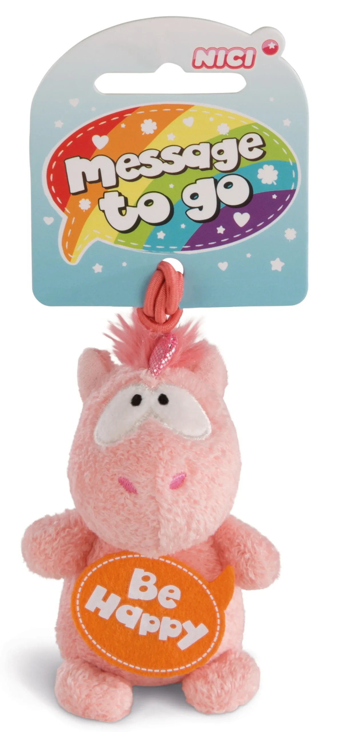 Das kuschelige rosa Einhorn Merry Heart von NICI hat eine elastische Schlaufe am Kopf. Die orange Filz-Sprechblase trägt die Aufschrift „Be Happy“.
