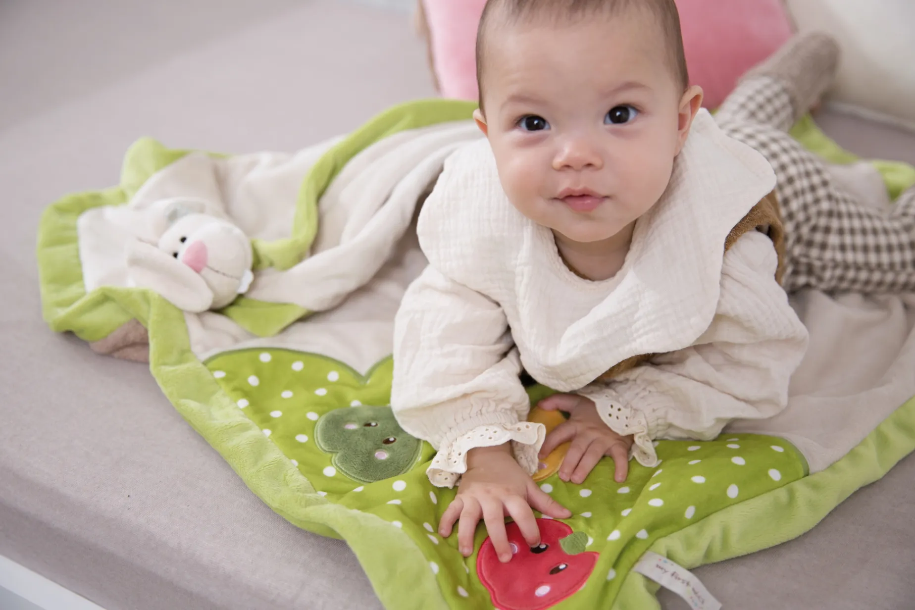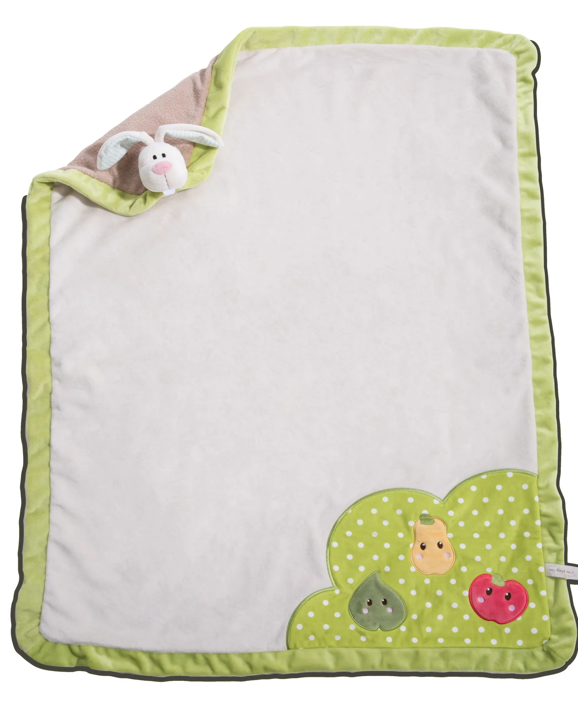 Die Baby Kuscheldecke (75 x 100cm) mit dem entzückenden Schmuse-Hasen an einer Ecke besteht aus einem flauschig weichen Plüschmaterial, das Gemütlichkeit und Wärme schafft. Ob als Liege-, Sitz- und Krabbeldecke oder um Baby damit zuzudecken, die hochwertige Verarbeitung und das zauberhafte Design mit Plüschapplikationen und Hasenköpfchen in 3-D machen aus der vielseitig einsetzbaren Decke einen unverzichtbaren Begleiter in Babys ersten Lebensjahren.