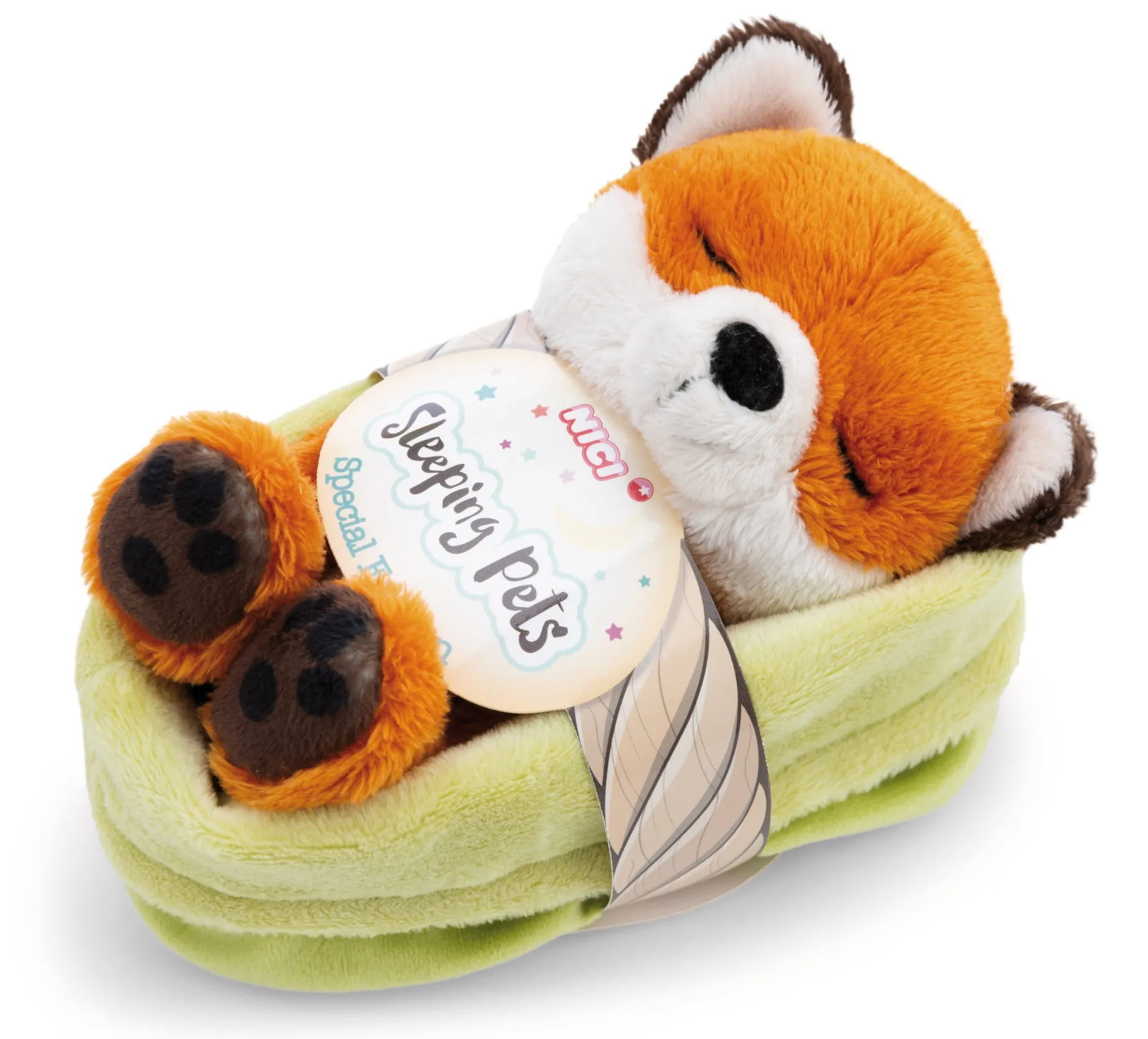 Zum Verlieben niedlich! Ob zum Kuscheln, Spielen, Trösten oder Einschlafen – das süße Fuchskind verzaubert mit seinem flauschigen Plüschfell in rotbraun und weiß, gestickten Schlafaugen, spitzen Ohren und einem buschigen Schwanz. Das schlafende Fuchsbaby hält ein kleines, grünes Blatt in seinen Vorderpfötchen und sorgt nicht zuletzt mit einer softig weichen Füllung für eine besonders kuschelige Haptik. Der 12cm große Fuchs liegt eingekuschelt in einem grünen Plüschkörbchen und fühlt sich nicht nur heimelig und gut aufgehoben, sondern kann auf diese Weise auch als Geschenk überreicht werden. Plüschfuchs und Plüschkörbchen sind einzeln bespielbar. Der Sleeping Pets Fuchs ist Teil der NICI GREEN Produktwelt. Für NICI GREEN Produkte verwenden wir fast ausschließlich Plüsch- und Füllstoffe, die aus recycelten Materialien bestehen. Hierfür werden vor allem recycelte PET-Flaschen zu RPET verarbeitet.