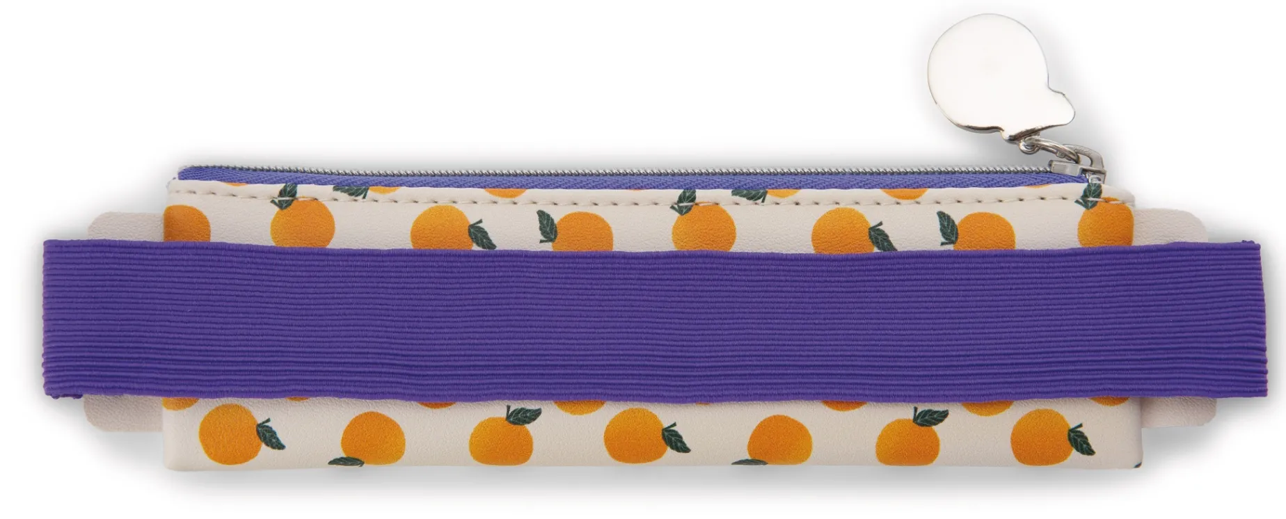 Das flache Mäppchen aus strapazierfähigem PU-Material ist gleichermaßen für Schule, Beruf oder die Handtasche, z.B. als Stiftemäppchen, für Kosmetik oder Getöns, geeignet. Mit Hilfe des breiten Gummibands kann es sicher an jedem DIN A5 Block befestigt werden und der Charm-Anhänger aus Metall sorgt für ein leichtes Öffnen und Schließen des Reißverschlusses. Die Vorderseite des Mäppchens zeigt ein badendes Capybara mit Orange auf dem Kopf und den Schriftzug „Happybara“.