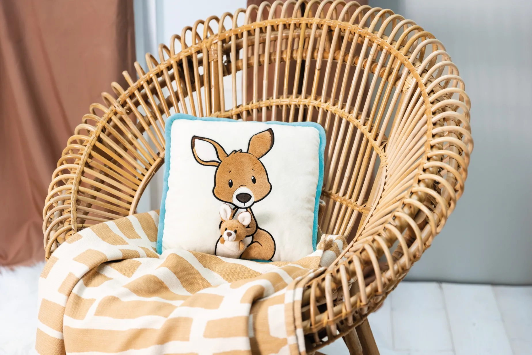 The square plush cushion from the Wild Friends collection by NICI features a high-quality plush appliqué of the cute kangaroo Kelly, which is featured on the beige-coloured front of the cuddly pillow. A small 3D kangaroo baby (7 cm) peeps out of Kelly’s belly pocket and has been fixed there. The back of the soft and fluffy cushion is printed with a colourful, graphic pattern and a turquoise piping ensures that the Wild Friends cushion becomes a stylish decorative accessory in the children’s room. The cushion is part of the NICI GREEN product world. For NICI GREEN products, we almost exclusively use plush and filling material made from recycled materials. Primarily recycled PET bottles are processed into RPET for this purpose.
