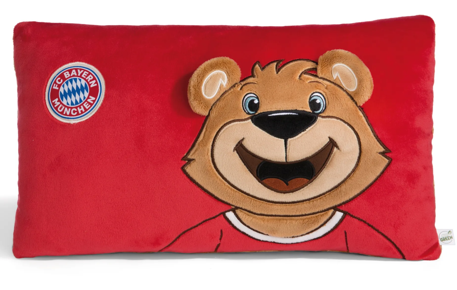 Mit dem rechteckigen, roten Plüschkissen mit gewebtem FCB Logo-Aufnäher holst du den Rekordmeister zu dir nach Hause. Kultmaskottchen Bär Berni ist als detaillierte Charakter-Applikation aus Plüsch mit niedlichen 3-D Ohren auf der Vorderseite zu sehen. Das kuschelige Kissen ist nicht nur im Kinderzimmer oder auf der Couch ein echter Hingucker, sondern begeistert auch als weiche Kopfunterlage. Das handliche Flauschkissen lässt sich überall mit hinnehmen und ist das ideale Geschenk für echte Fans! Das Kissen ist Teil der NICI GREEN Produktwelt. Für NICI GREEN Produkte verwenden wir fast ausschließlich Plüsch- und Füllstoffe, die aus recycelten Materialien bestehen. Hierfür werden vor allem alte PET-Flaschen zu RPET verarbeitet.
