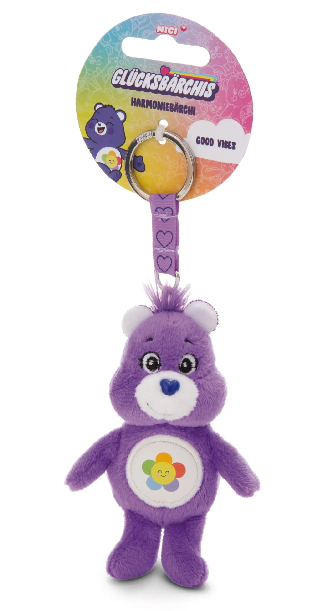 Mit einem generationsübergreifenden Bekanntheitsgrad von 98% sind die Glücksbärchis, auch bekannt als Care Bears, seit den frühen 80-er Jahren im TV präsent und sorgen heute, mit einer großen Social Media Fan Community, für jede Menge Glück und Liebe in jeder Altersklasse. Als hochwertiger Schlüsselanhänger aus flauschig weichem NICI-Plüsch ermutigt das violette Harmoniebärchi mit der Blume auf dem Bäuchlein jeden, sein Bestes zu geben. Der entzückende Plüschanhänger mit einem stabilen Metallschlüsselring, ist ideal für den Schlüsselbund, als Glücksbringer oder als Accessoire für Taschen, Rucksäcke und Schulranzen.