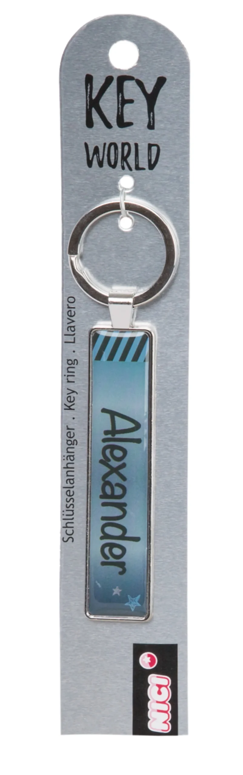 Der metallische Schlüsselanhänger mit der Aufschrift Alexander ist in Blautönen gehalten und gehört zur NICI Key World Kollektion. Das schmale Design und die tolle Farbgebung machen den Schlüsselanhänger zu einem treuen Begleiter.