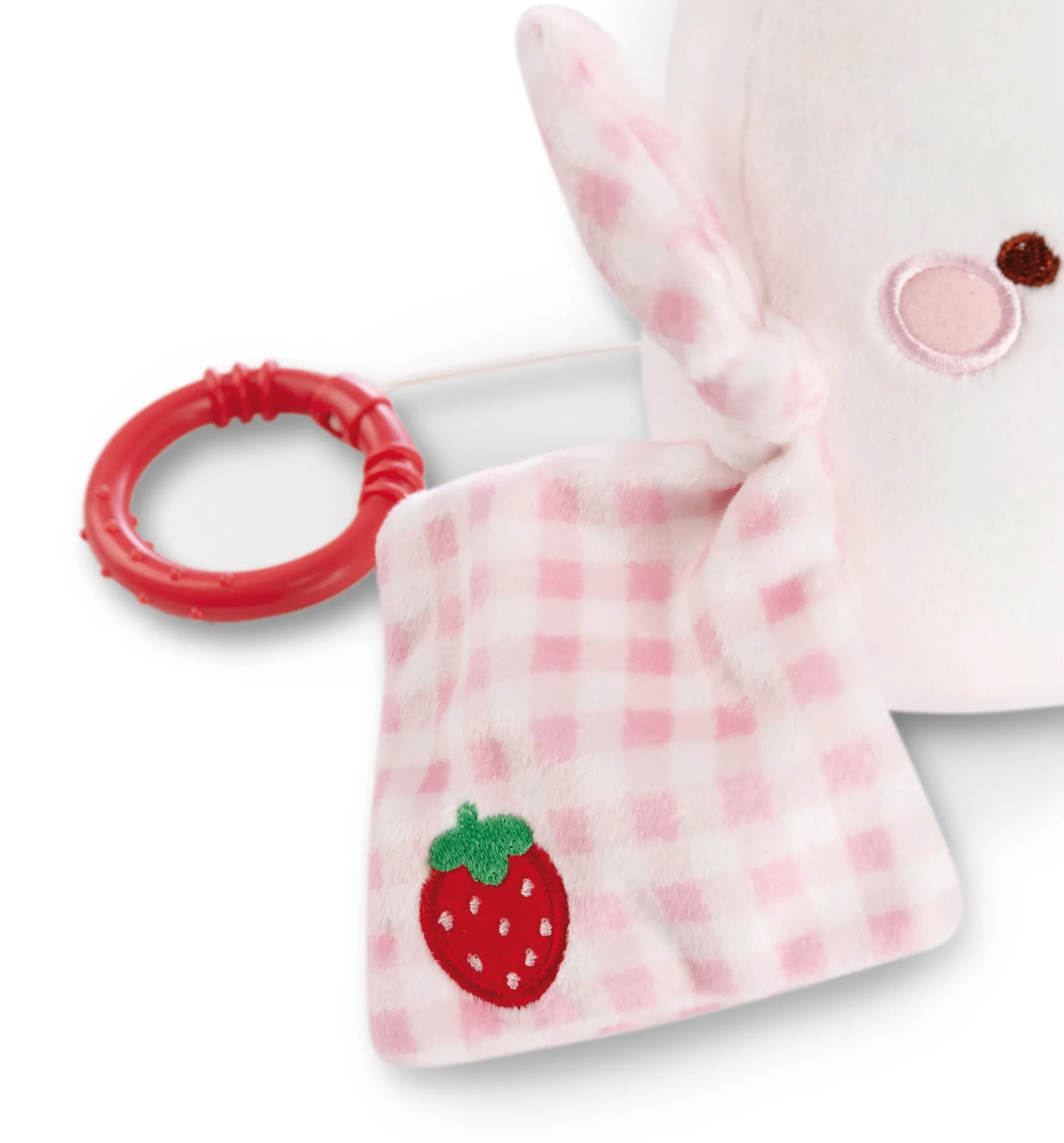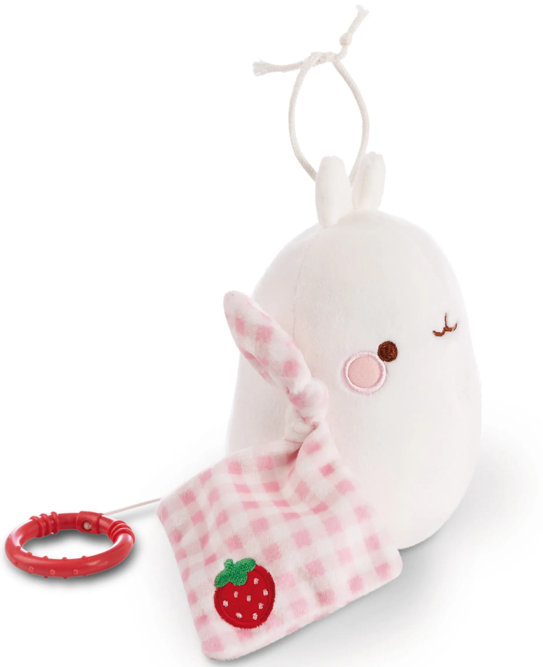 Die plüschige Spieluhr in Gestalt von Molang, dem liebenswerten Charakter aus der gleichnamigen TV-Serie und bekannt aus Social Media, ist ein unverzichtbares Geschenk zur Geburt oder Taufe. Zieht man an dem kleinen Ring, der mittels einer Schnur am softig weichen Körper des 15cm großen Molangs befestigt ist, kommt das integrierte (und herausnehmbare) Spielwerk zum Einsatz und Baby wird mit Brahms Wiegenlied sanft ins Reich der Träume begleitet. Molang trägt sein rosa-weiß karierte Schmusetuch mit einer gestickten Erdbeere und macht das Kinderzimmer zu einem Wohlfühlort. Mit Hilfe von zwei Bändchen lässt sich die Spieluhr ganz einfach am Bettchen, Kinderwagen oder Babyschale befestigen. Die Spieluhr aus der MOLANG Baby Kollektion von NICI ist eine tolle Einschlafhilfe und fördert gleichzeitig motorische und sensorische Fähigkeiten der Allerkleinsten.